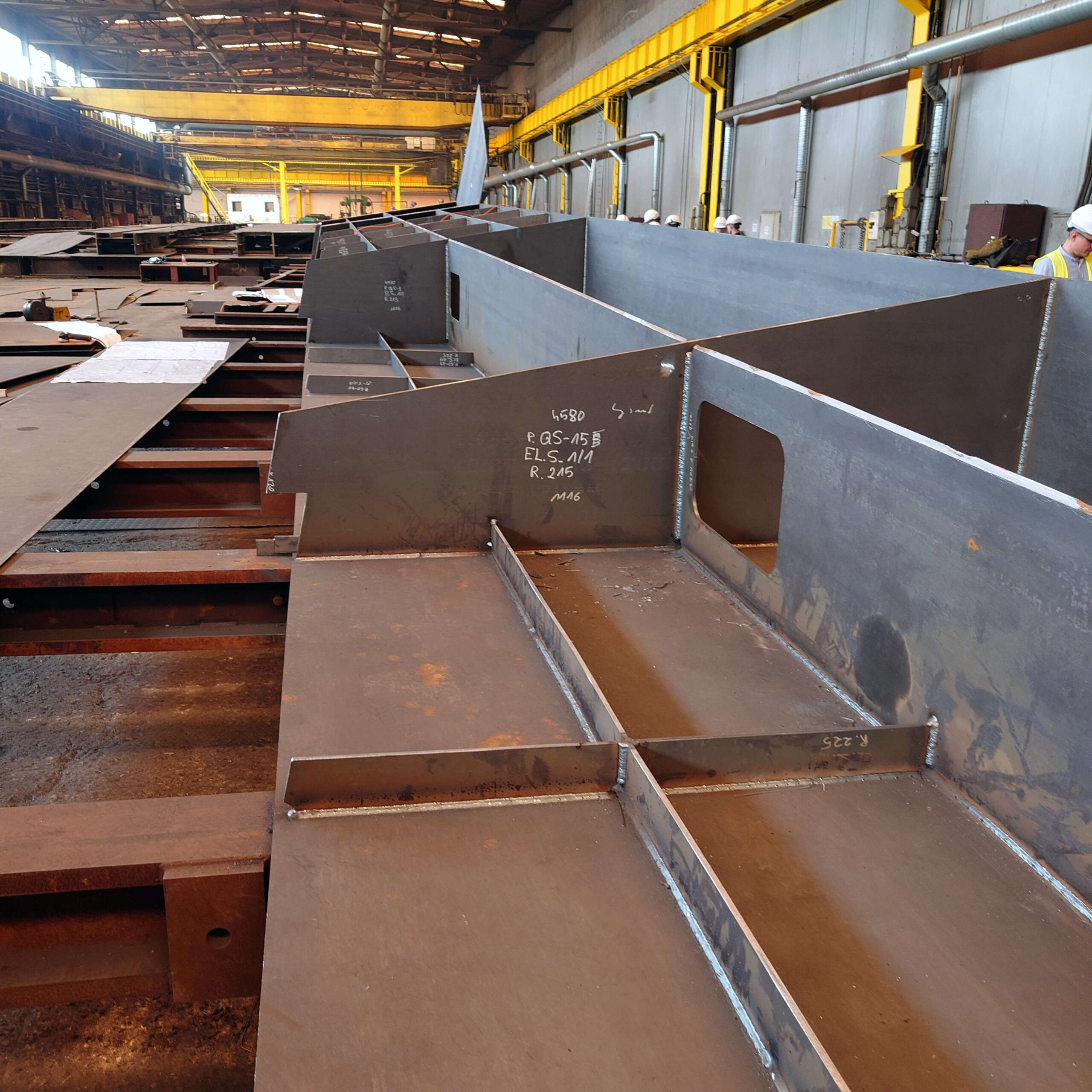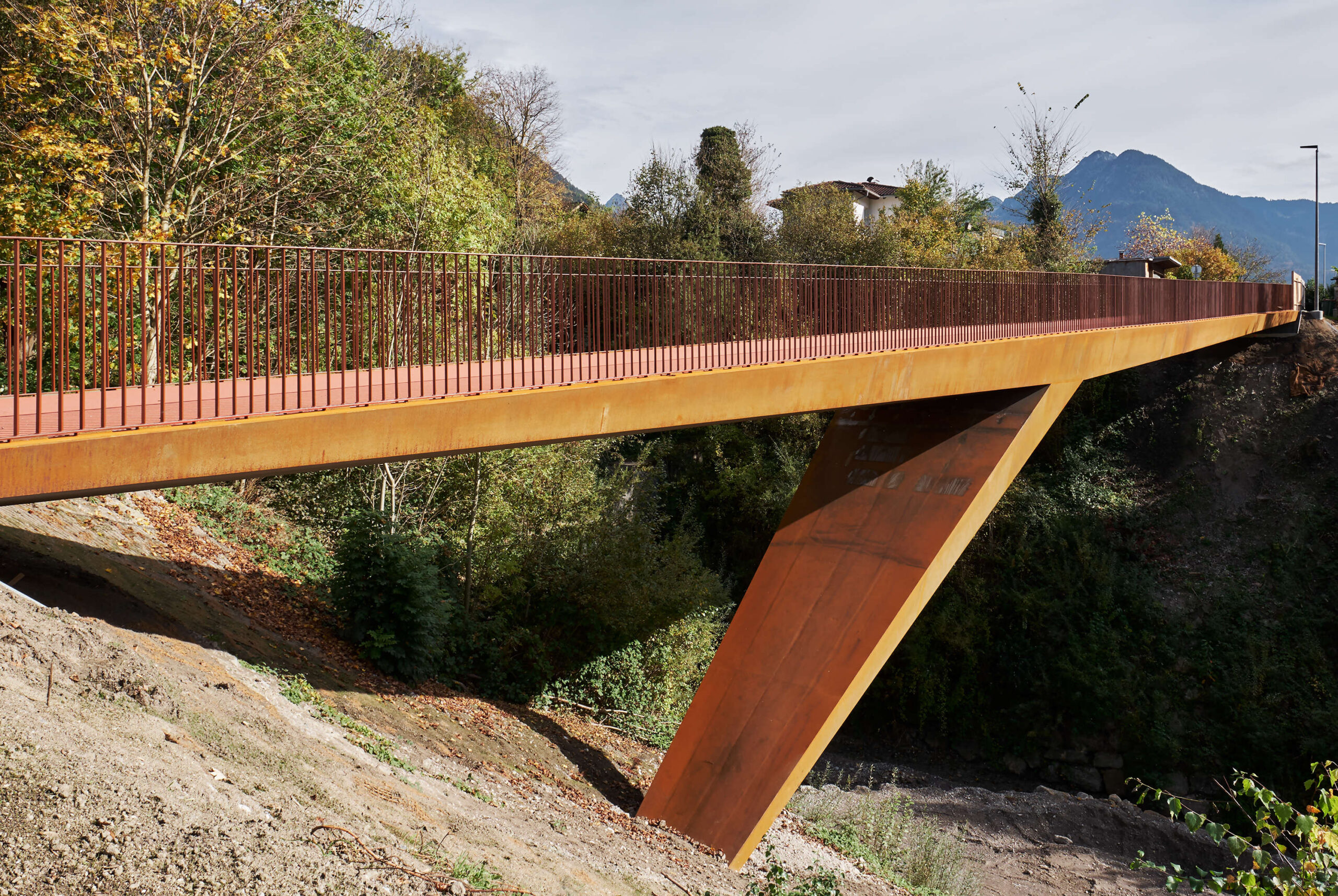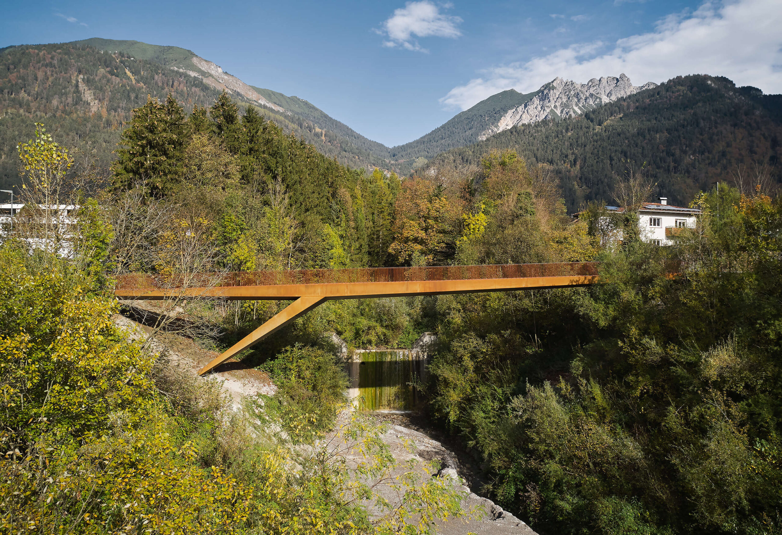 Das gesamte Tragwerk wurde aus wetterfestem Stahl errichtet. Tragwerk und Stütze sind als luftdichter Stahlhohlkasten mit Ober- und Untergurtdeckblech, Längsschotten, Querschotten und örtlichen Aussteifungsstegen ausgeführt. Als Material wurde S355J2W gewählt. Die Konstruktionshöhe des Tragwerks folgt dem Momentenverlauf und ist bei der Stütze 138 cm und bei den Widerlagern 71 cm hoch. Das Untergurtdeckblech ist gevoutet ausgeführt, damit wird eine elegante Seitenansicht erreicht.
