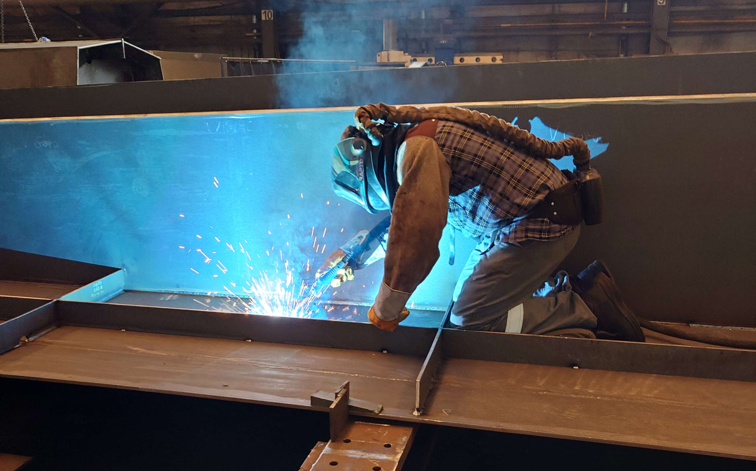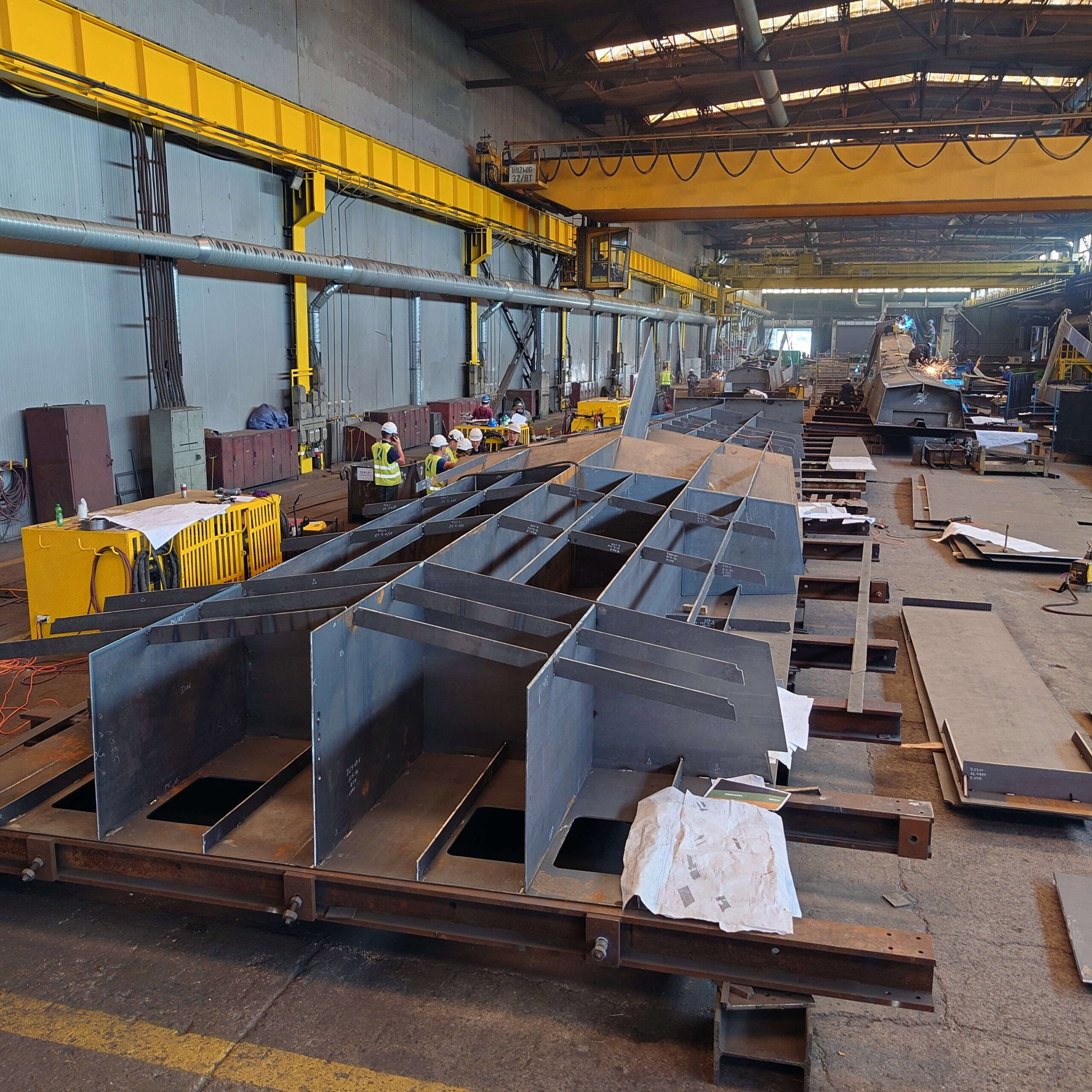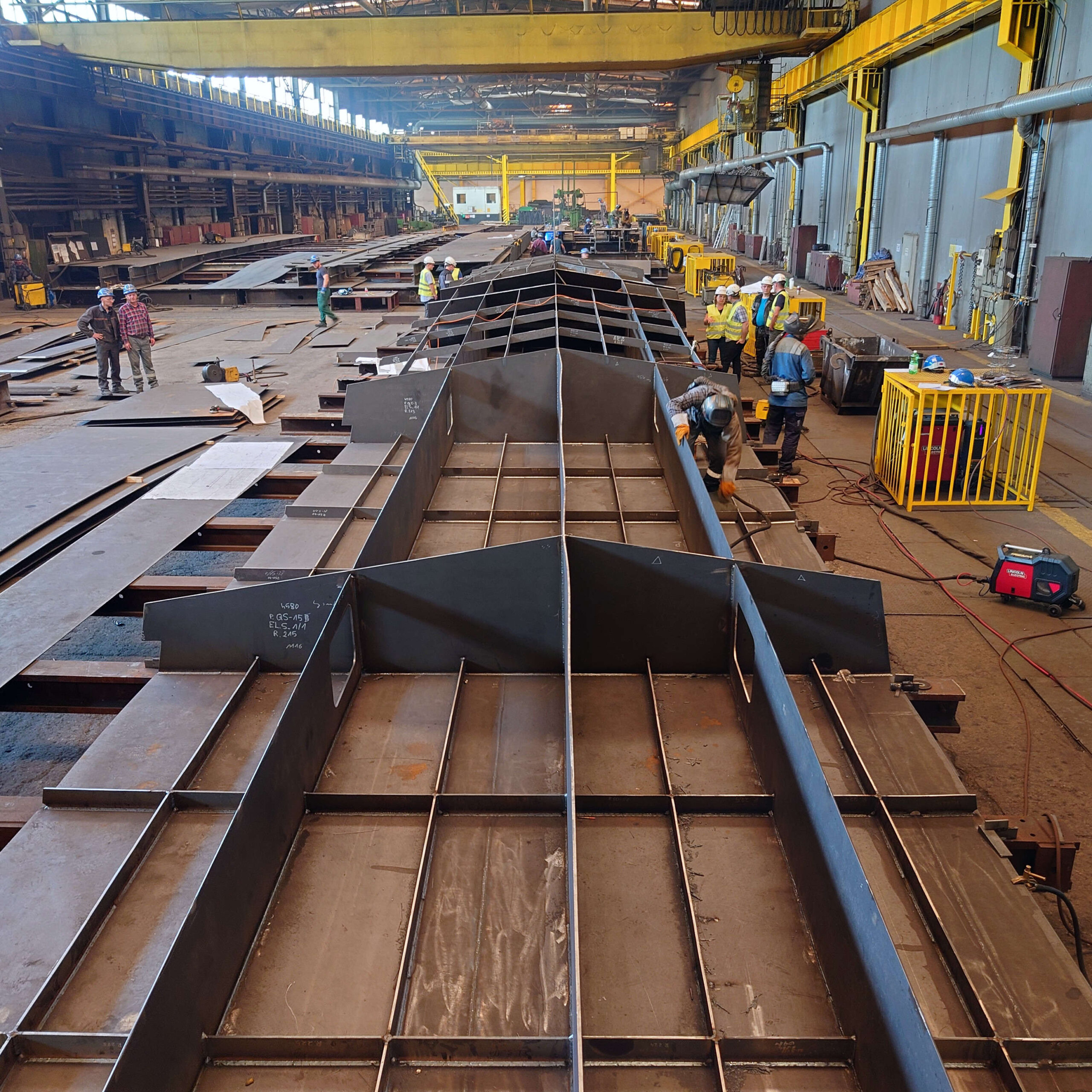 Das gesamte Tragwerk wurde aus wetterfestem Stahl errichtet. Tragwerk und Stütze sind als luftdichter Stahlhohlkasten mit Ober- und Untergurtdeckblech, Längsschotten, Querschotten und örtlichen Aussteifungsstegen ausgeführt. Als Material wurde S355J2W gewählt. Die Konstruktionshöhe des Tragwerks folgt dem Momentenverlauf und ist bei der Stütze 138 cm und bei den Widerlagern 71 cm hoch. Das Untergurtdeckblech ist gevoutet ausgeführt, damit wird eine elegante Seitenansicht erreicht.