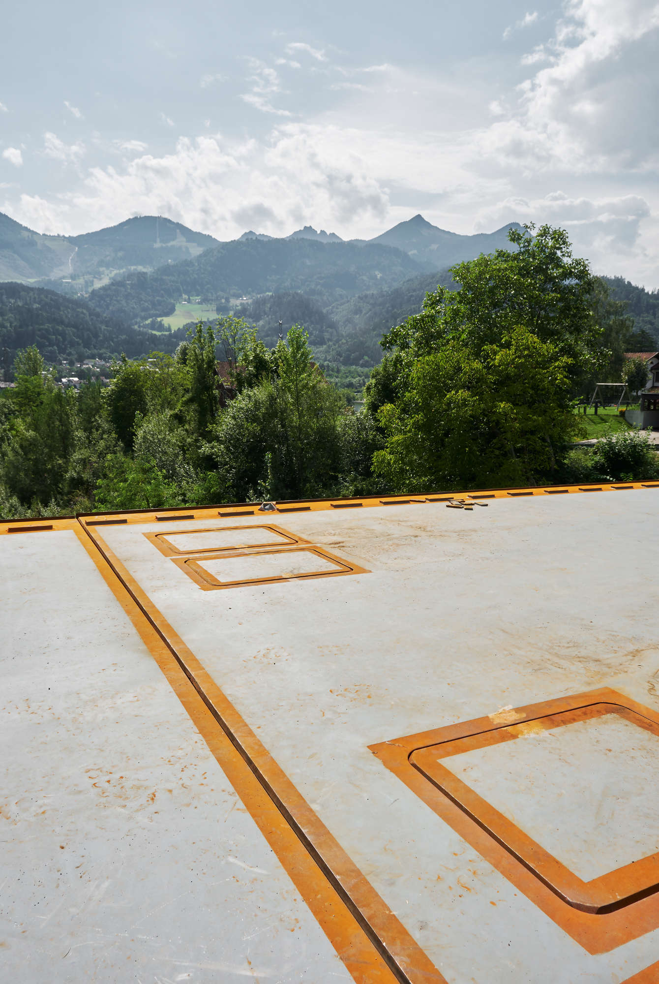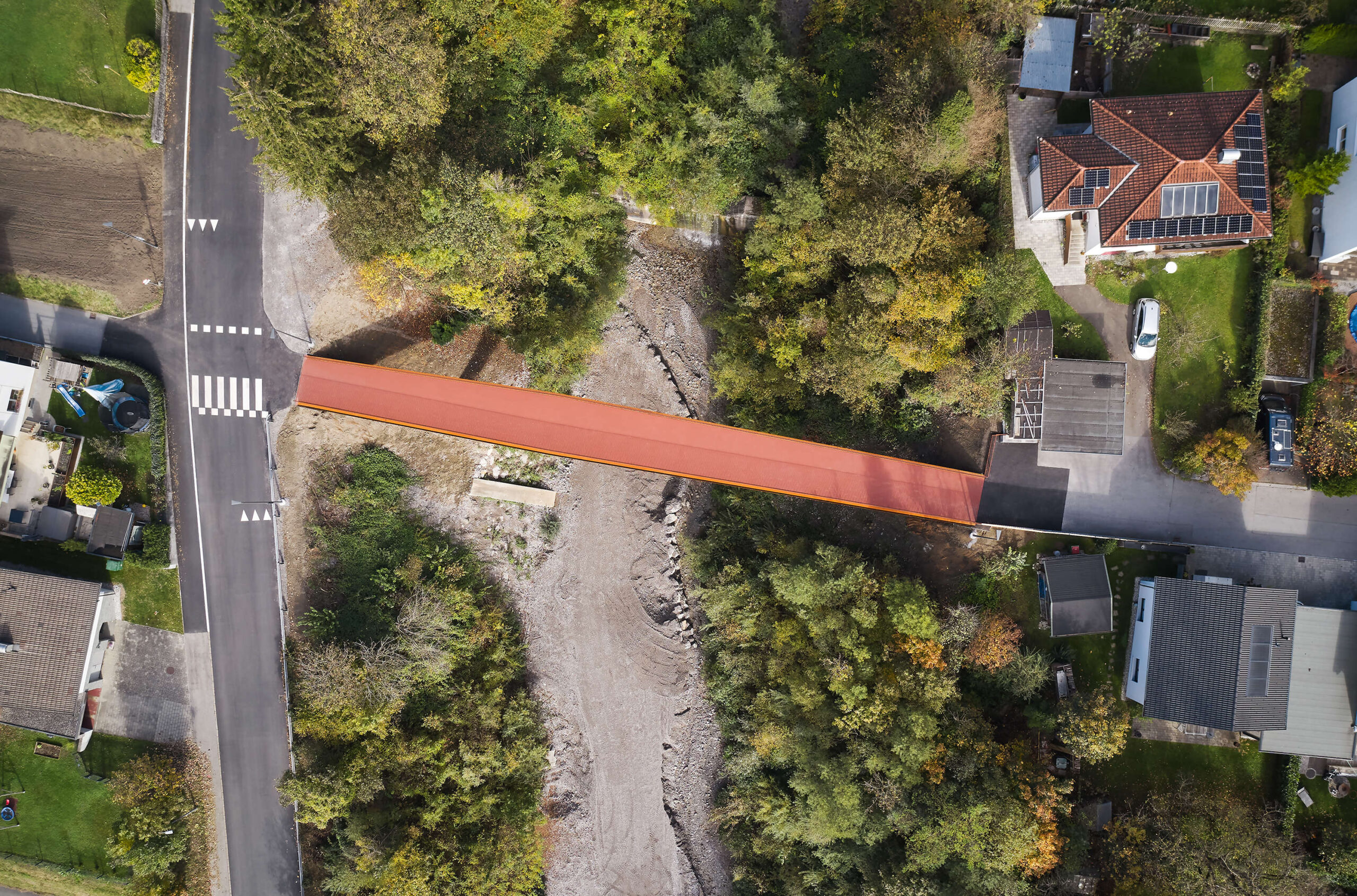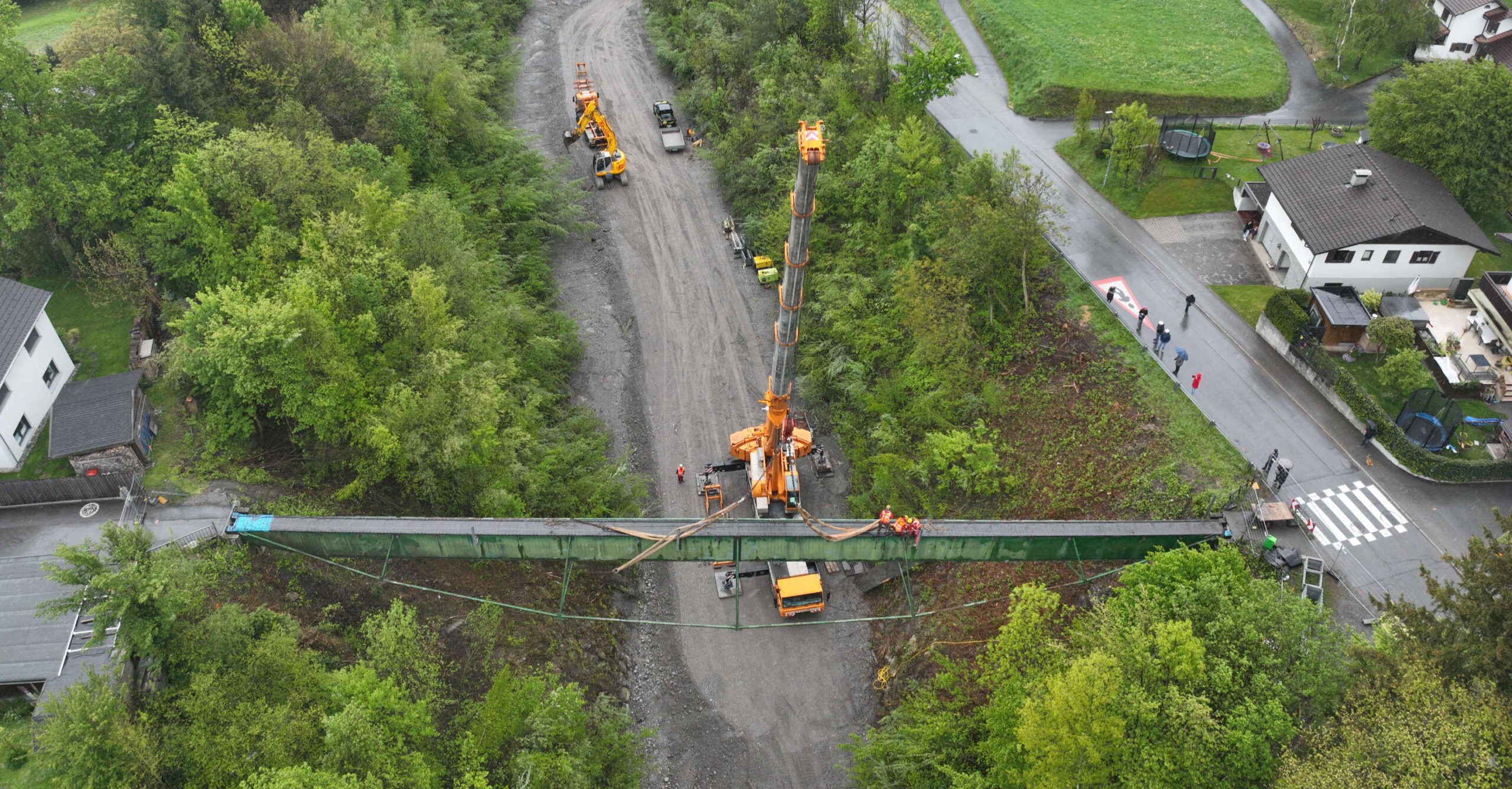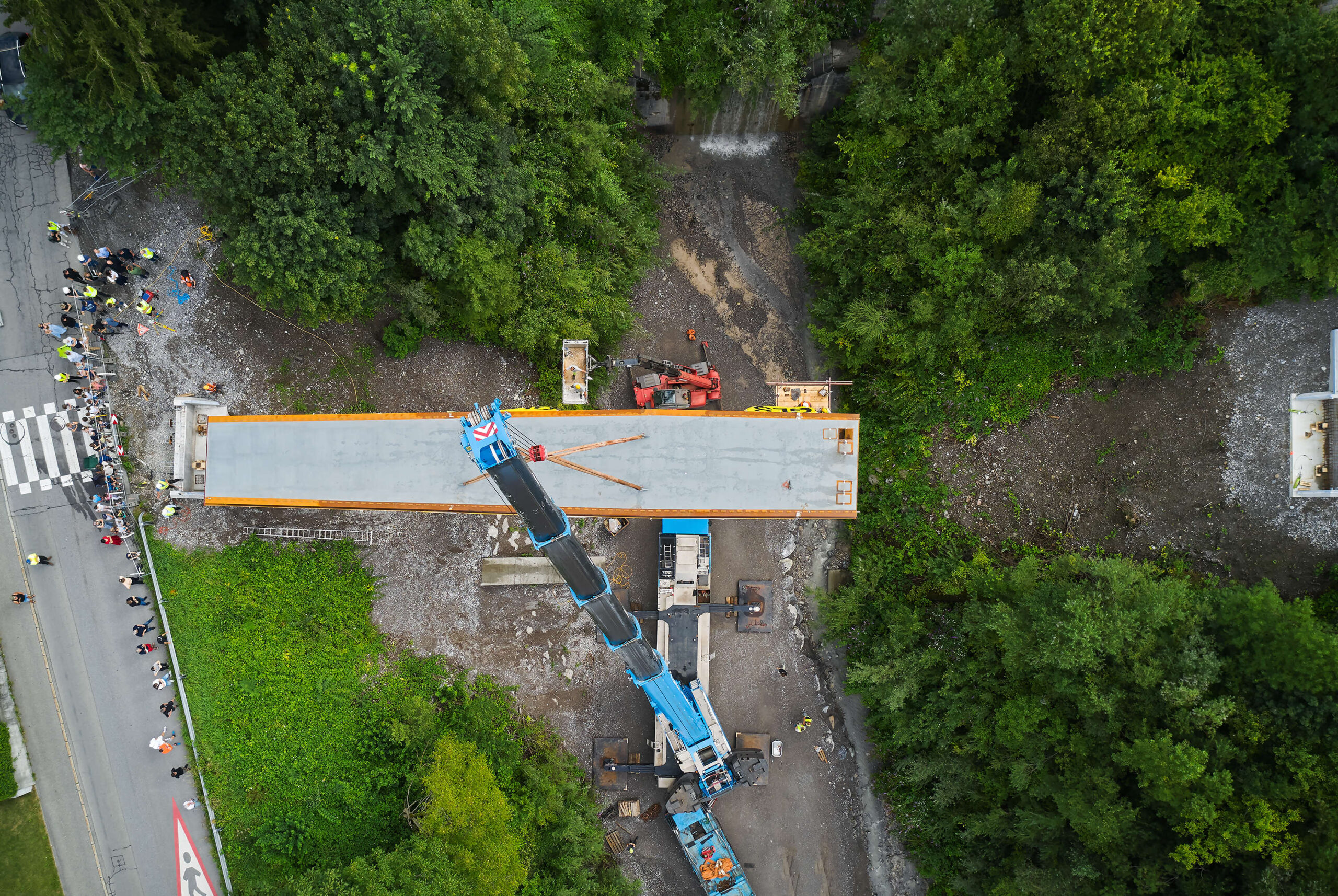 Das ungleichschenkelige Tragwerk hat sich durch die Zugänglichkeit zu den Hangflanken entwickelt. Orographisch links konnte kein Telekran oder Schwertransport zufahren. Daher wurden alle schweren Bauelemente orographisch rechts projektiert, angeliefert und eingehoben. Links wurde das leichteste Bauelement geplant.