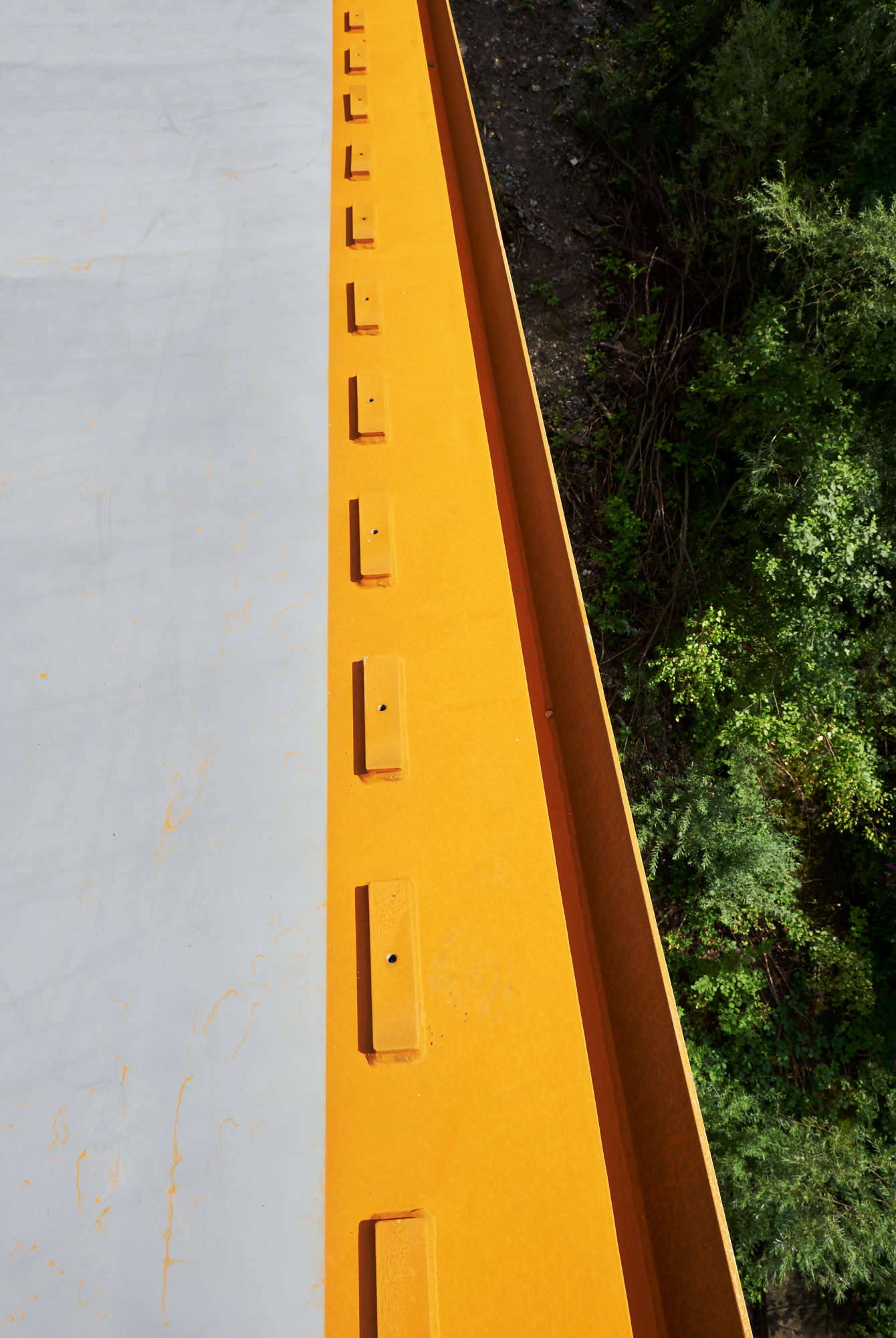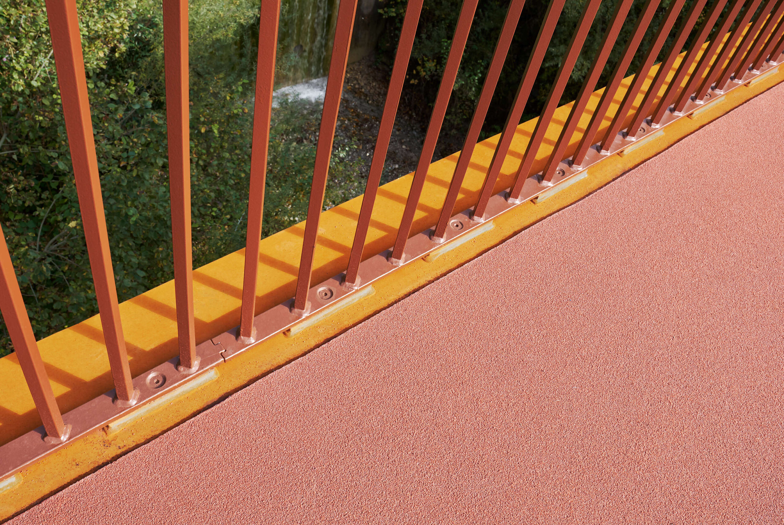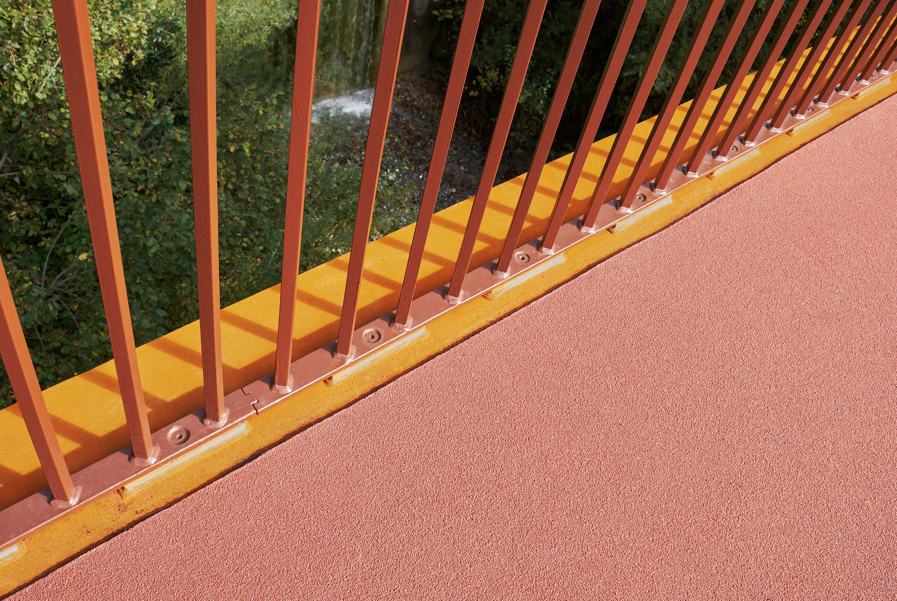 Auf das Tragwerk wurde ein 121 cm hohes Brückengeländer montiert. Die Brücke wurde mit einem Quergefälle von 1,5 % ausgeführt. Die Entwässerungsrinne ist gut einsehbar und kann einfach gereinigt werden. Das Stahldeckblech wurde mit einem quarzsandeingestreuten Dünnbelag versehen, dieser ist rutschhemmend. Dieser Belag ist dauerhaft, sehr widerstandsfähig und für den Winterdienst geeignet.