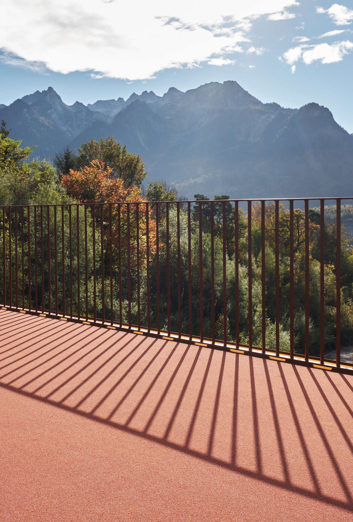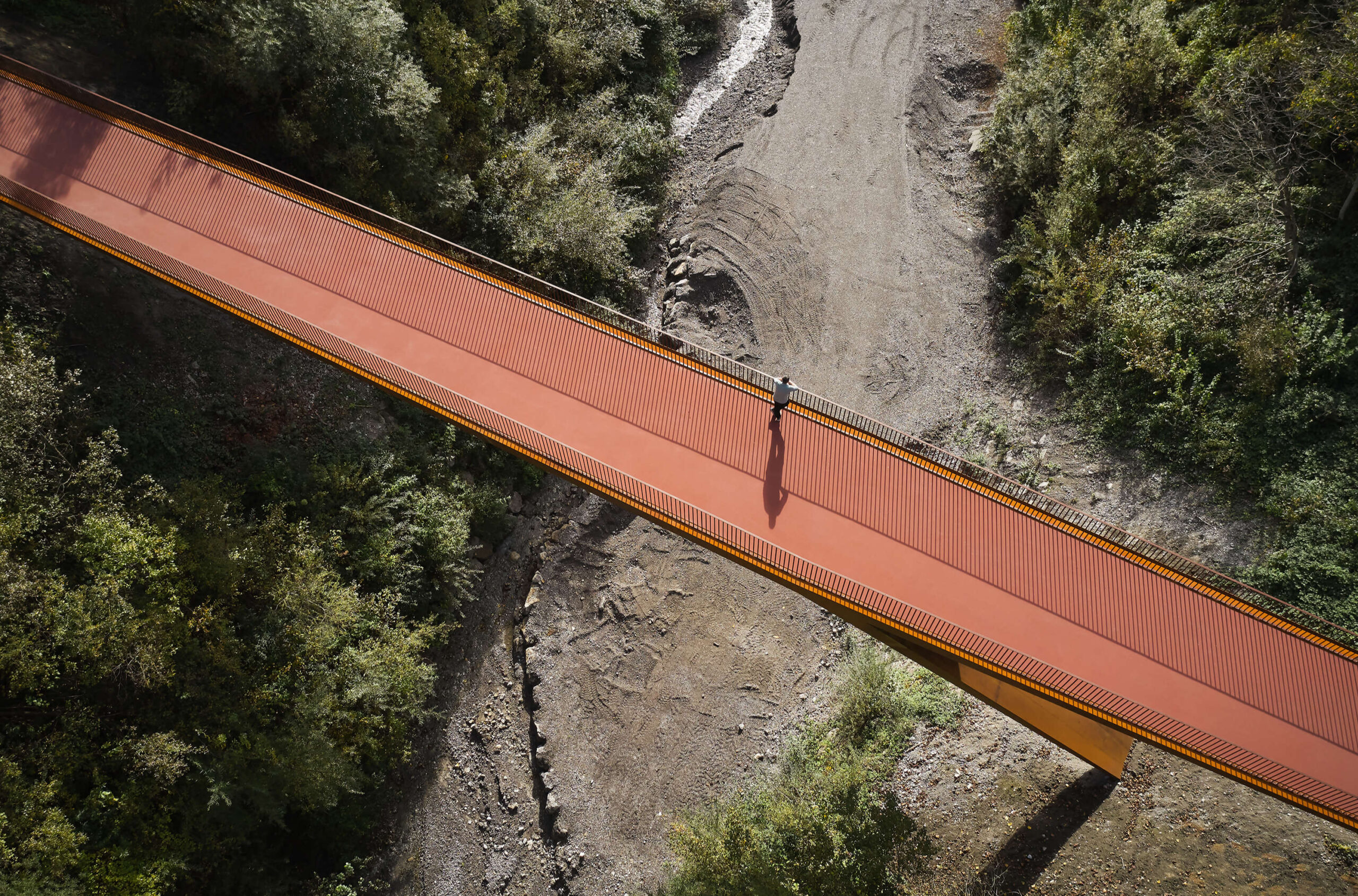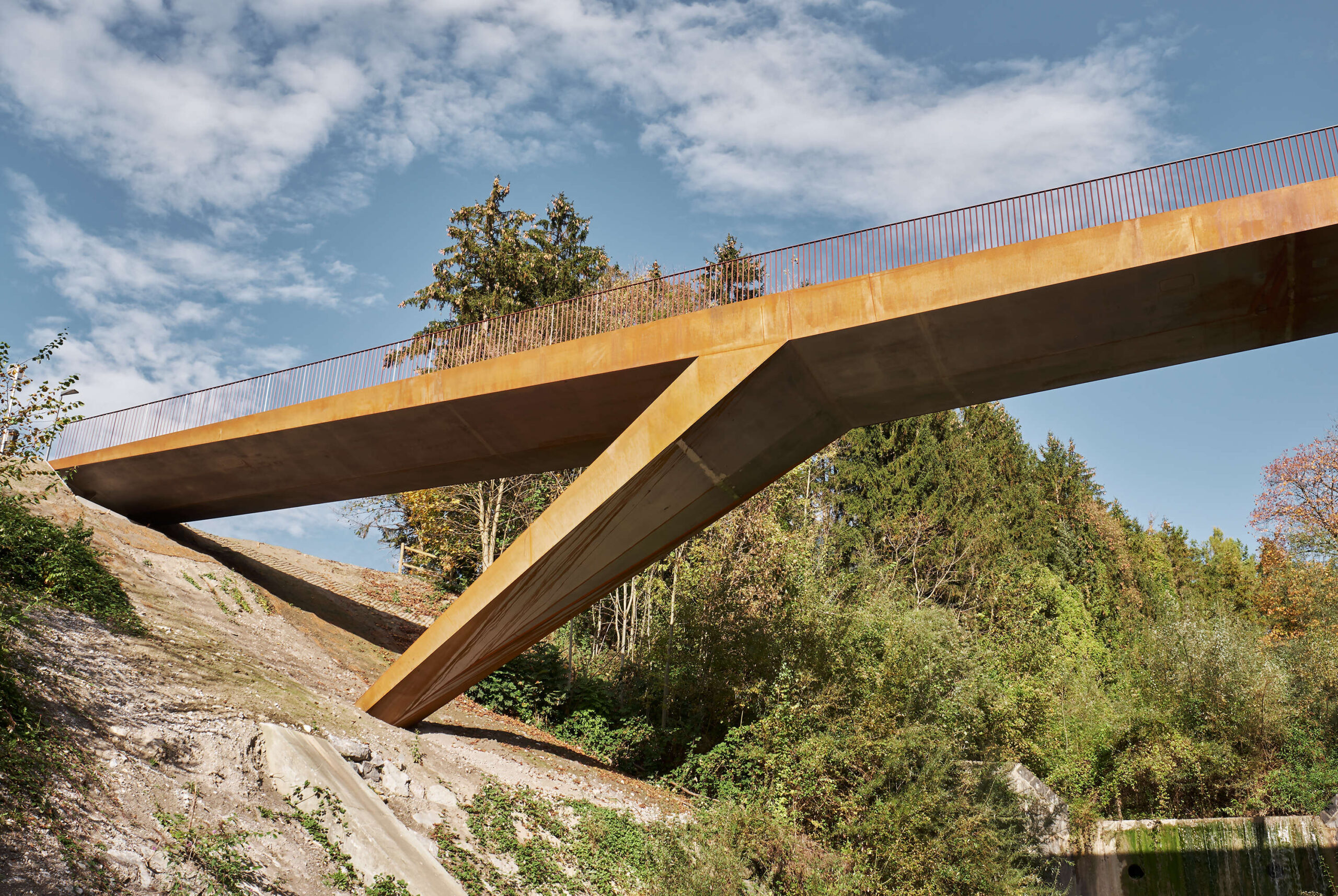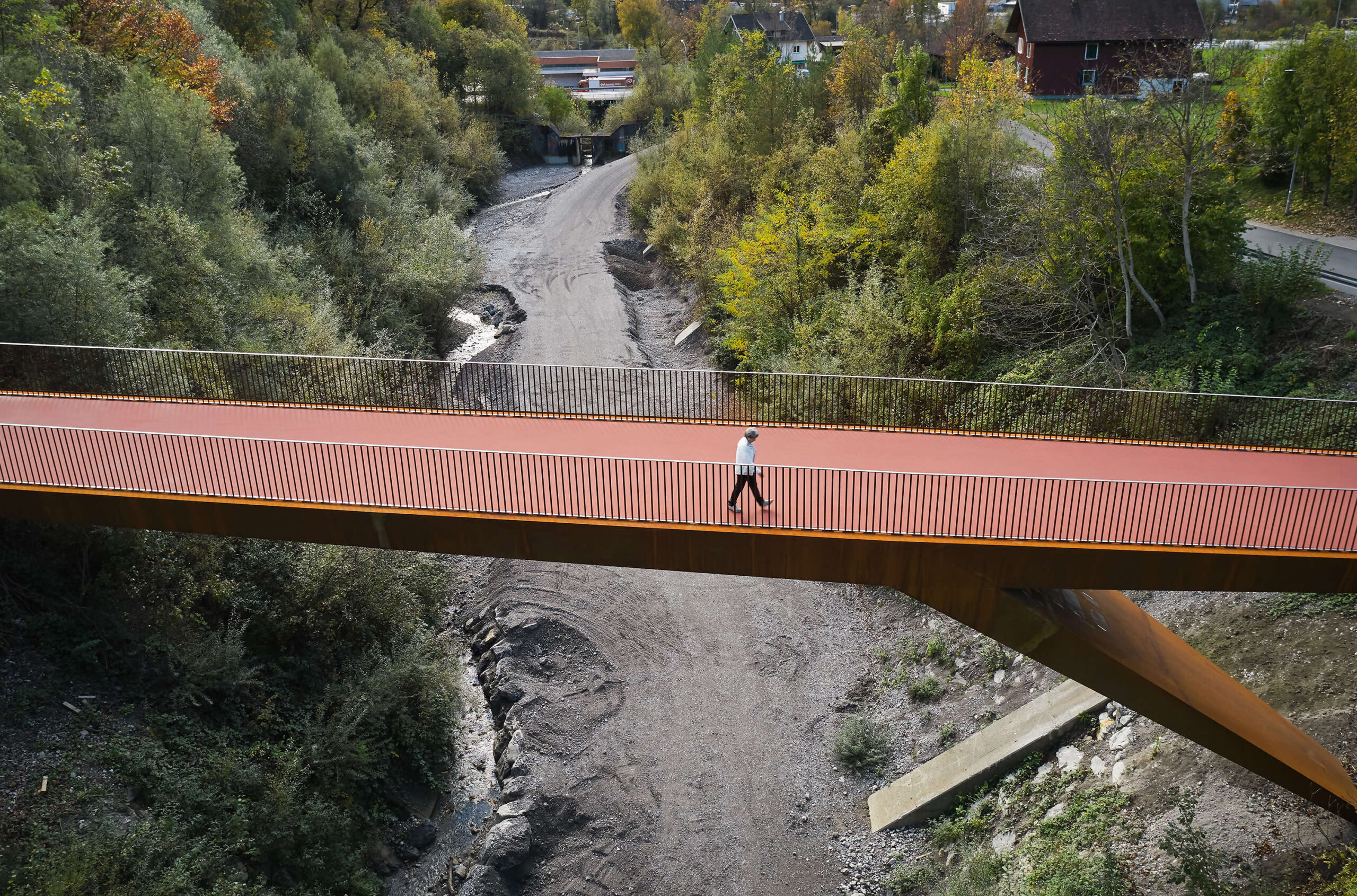 Der konisch zulaufende Brückenkörper aus wetterfestem Stahl wird von einer ebenso leicht konisch zulaufenden Stütze unterstellt und überspannt in schlichter Eleganz das tiefe Galgentobel-Bachbett. Der beeindruckende Ausblick auf die umliegende Bergkulisse des Rätikons lädt zum Verweilen ein, unterstützt durch die Aufweitung in der Mitte der Brücke.