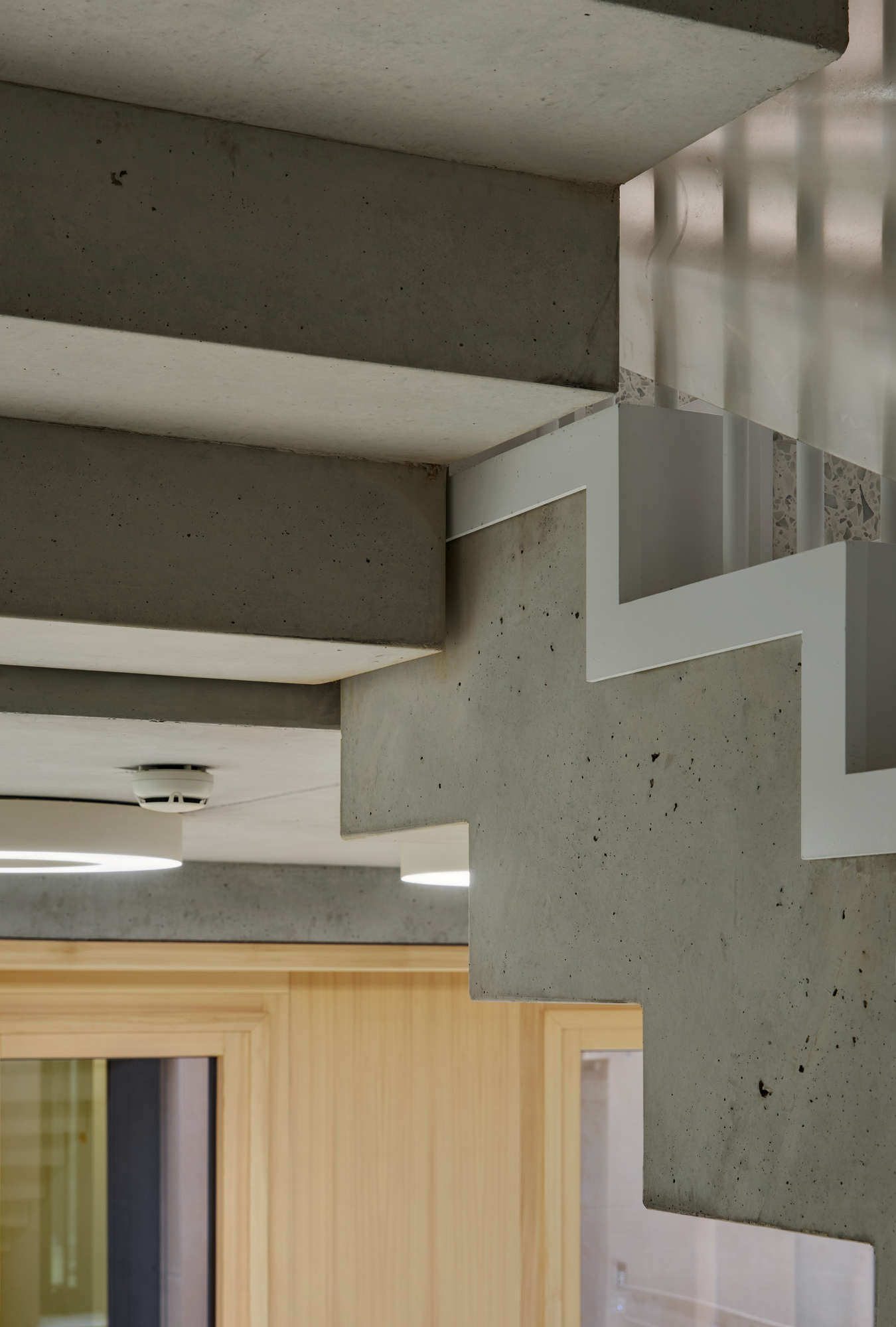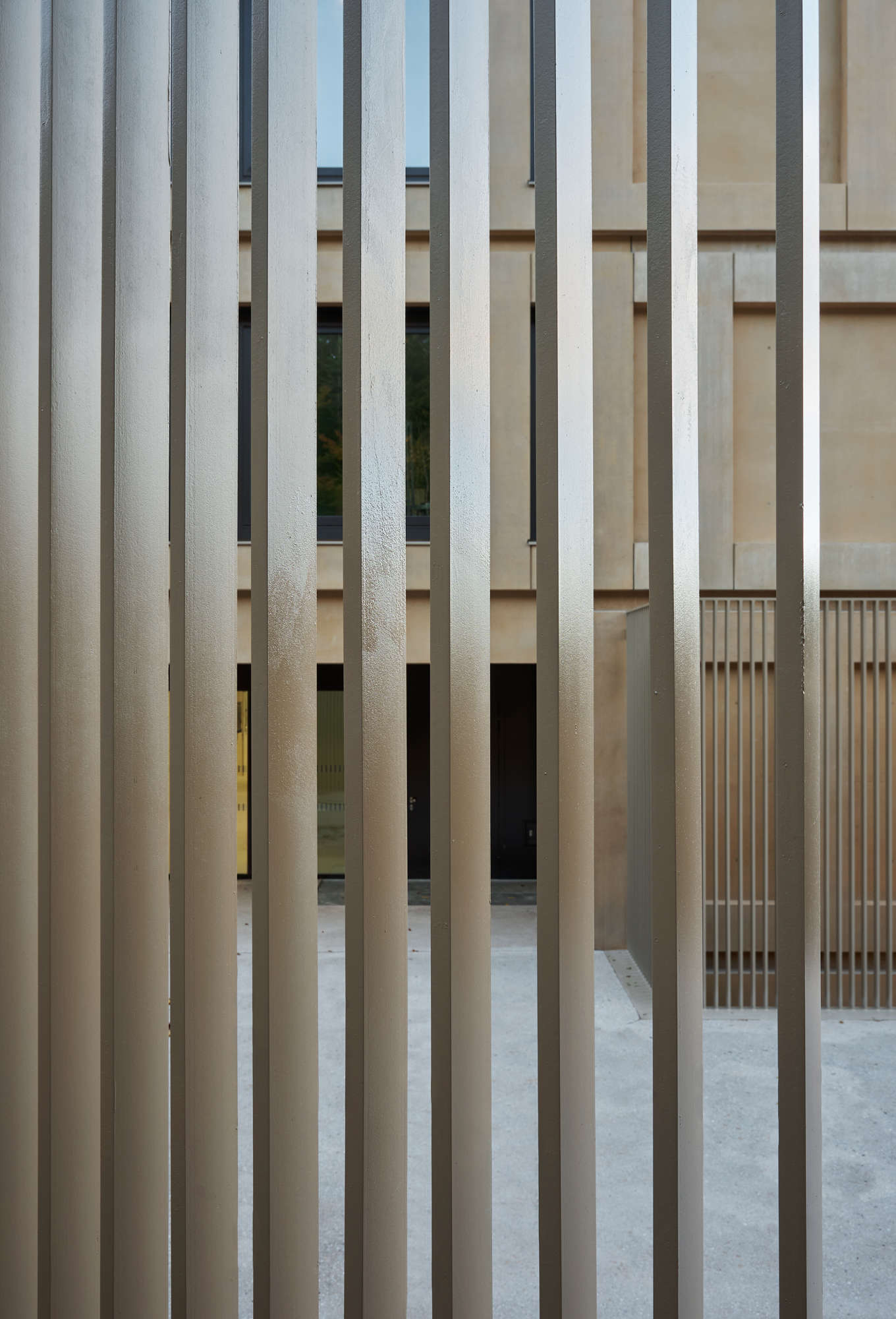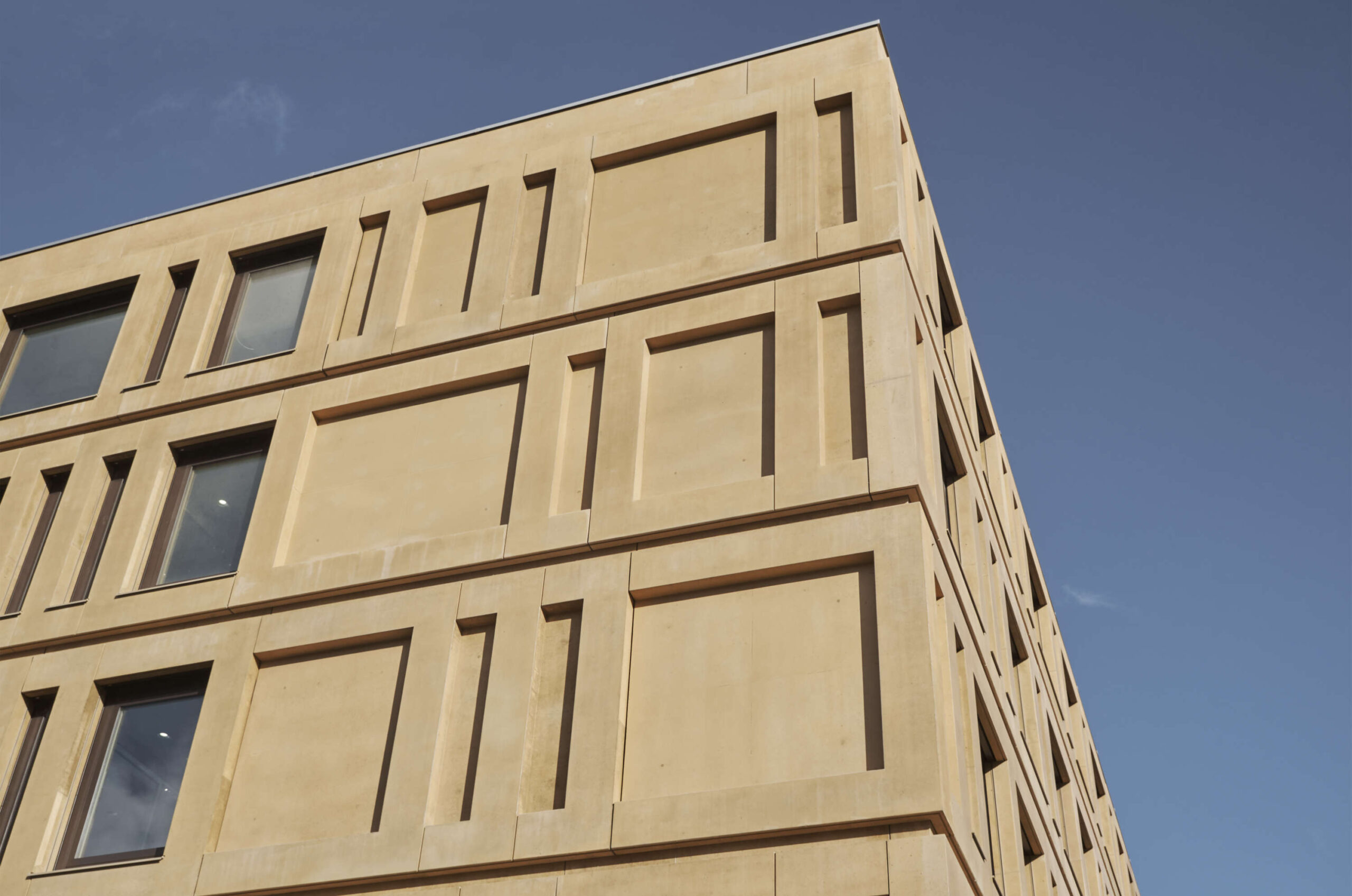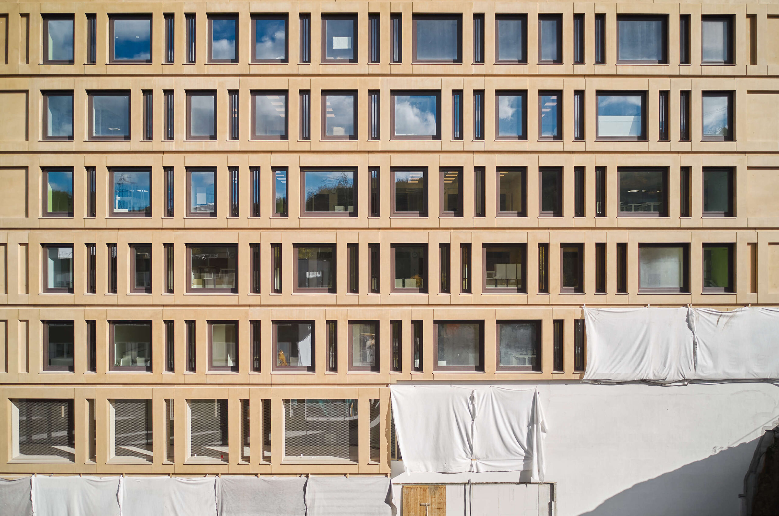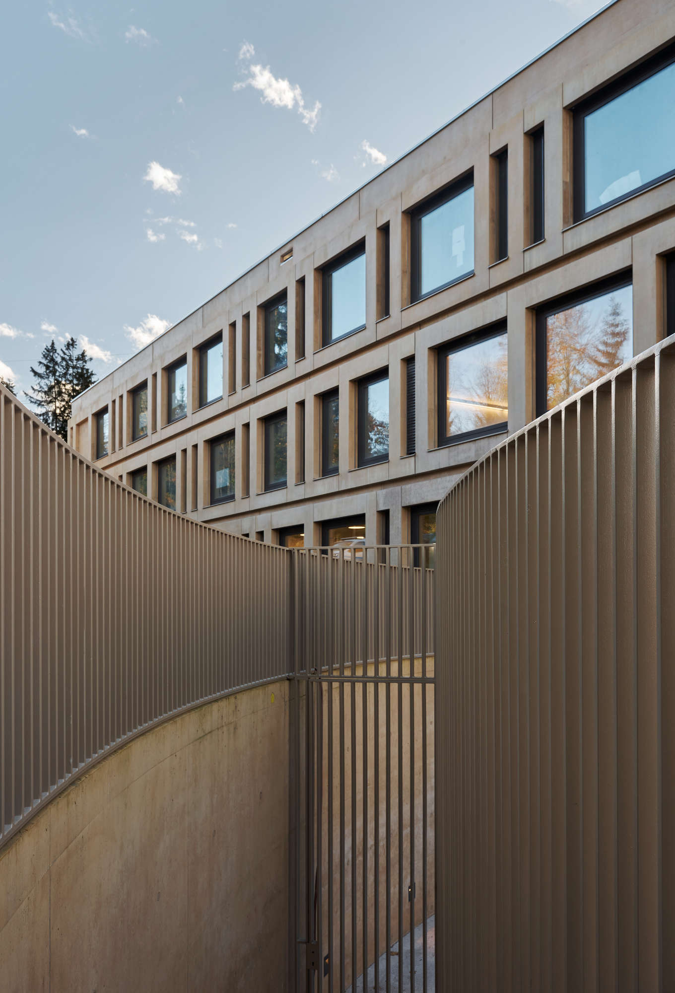 Die Fassade wurde mit Stahlbetonfertigteilen errichtet. Der Beigeton der Fertigteile vermittelt einen warmen, freundlichen Eindruck.