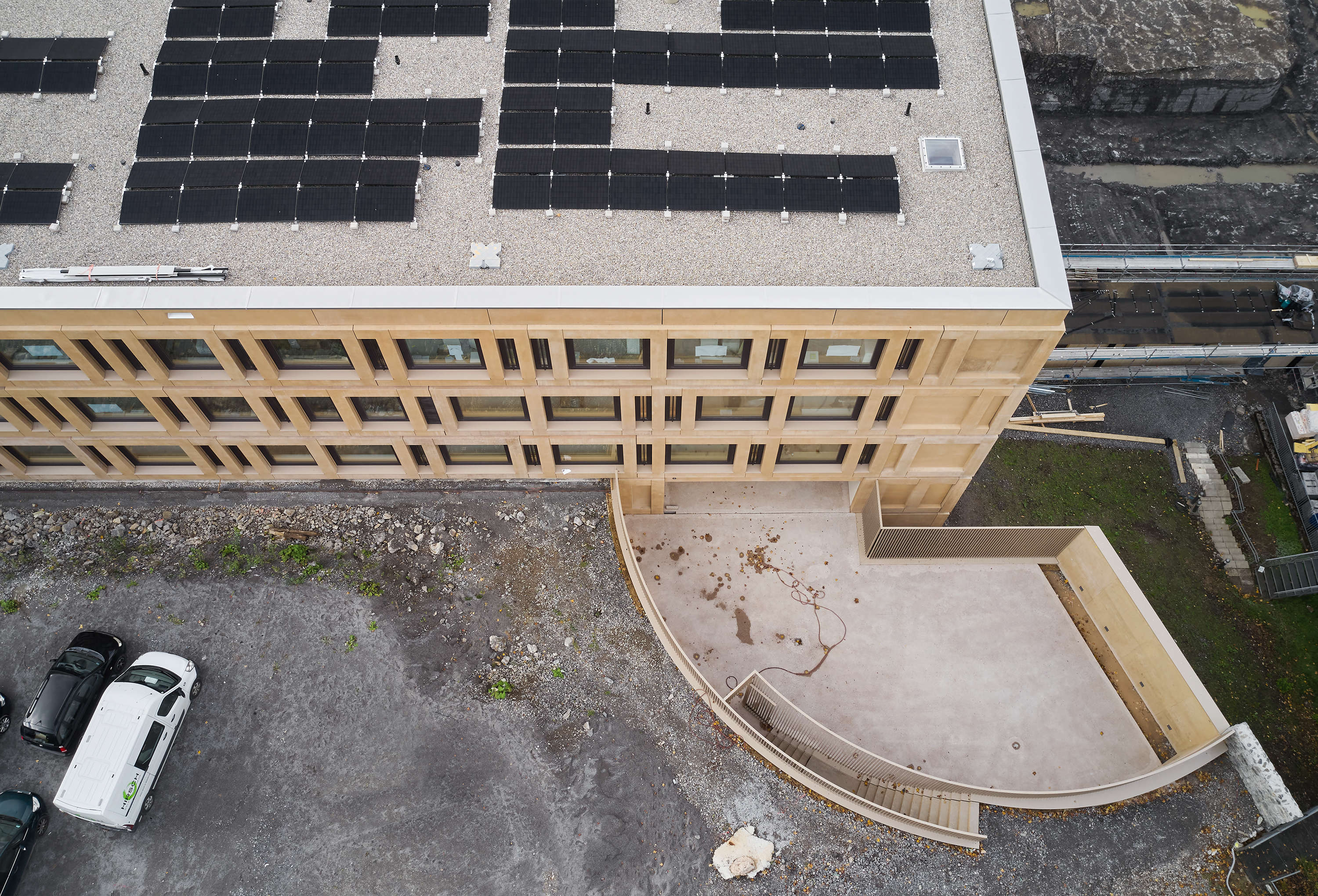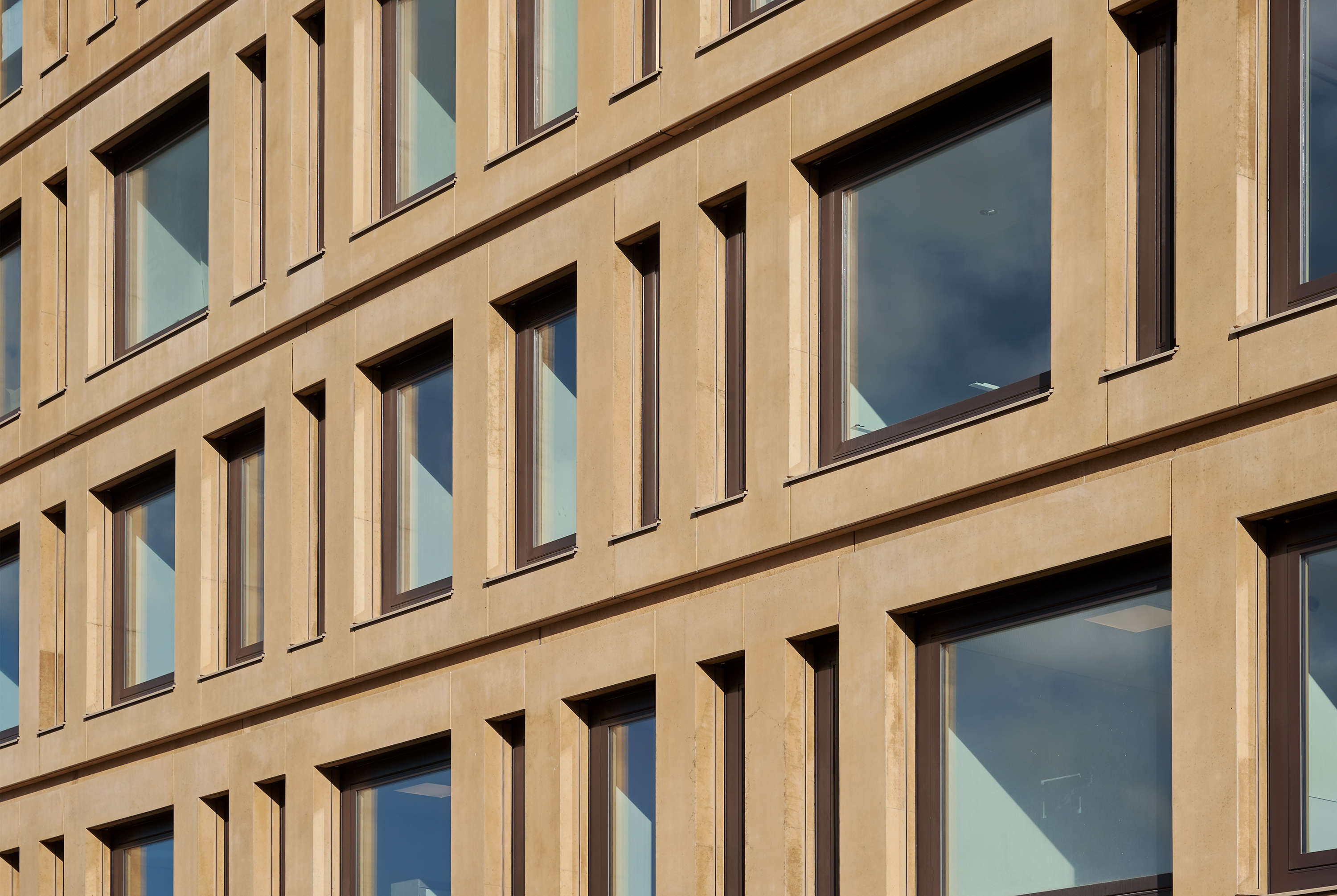 Die Fassade wurde mit Stahlbetonfertigteilen errichtet. Der Beigeton der Fertigteile vermittelt einen warmen, freundlichen Eindruck.