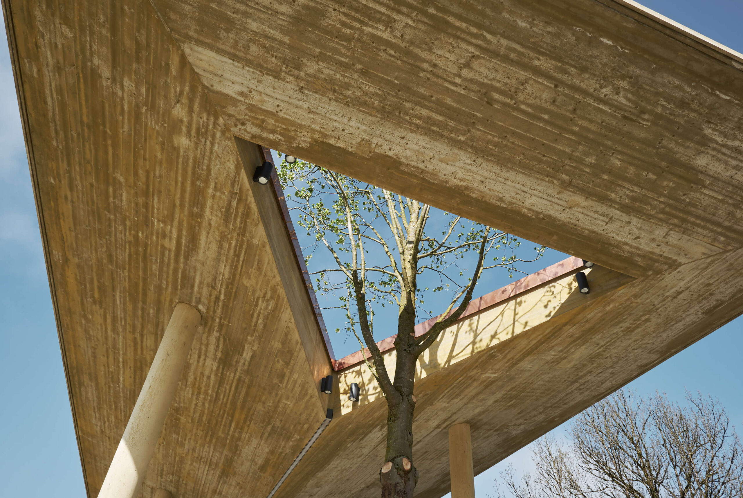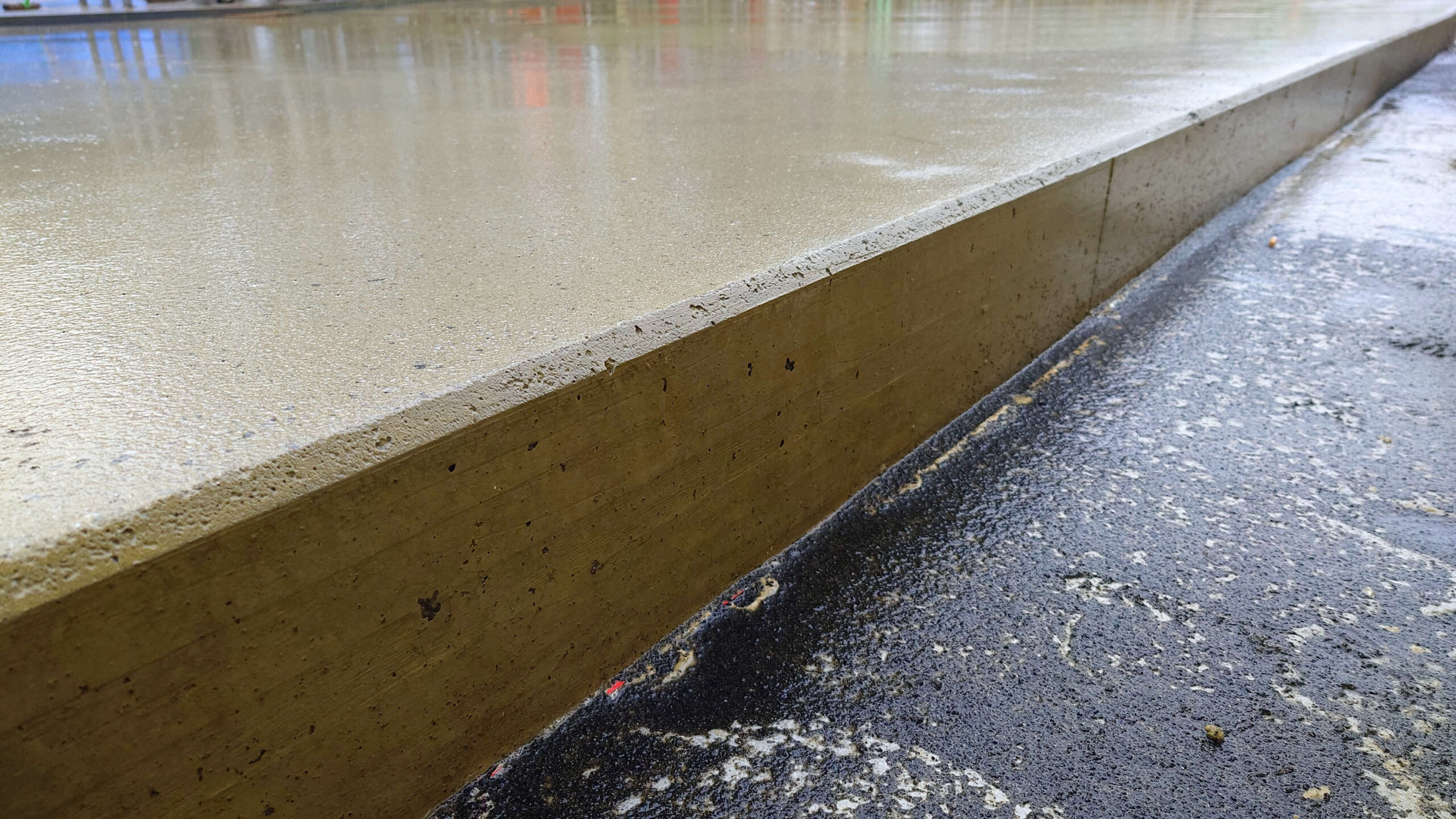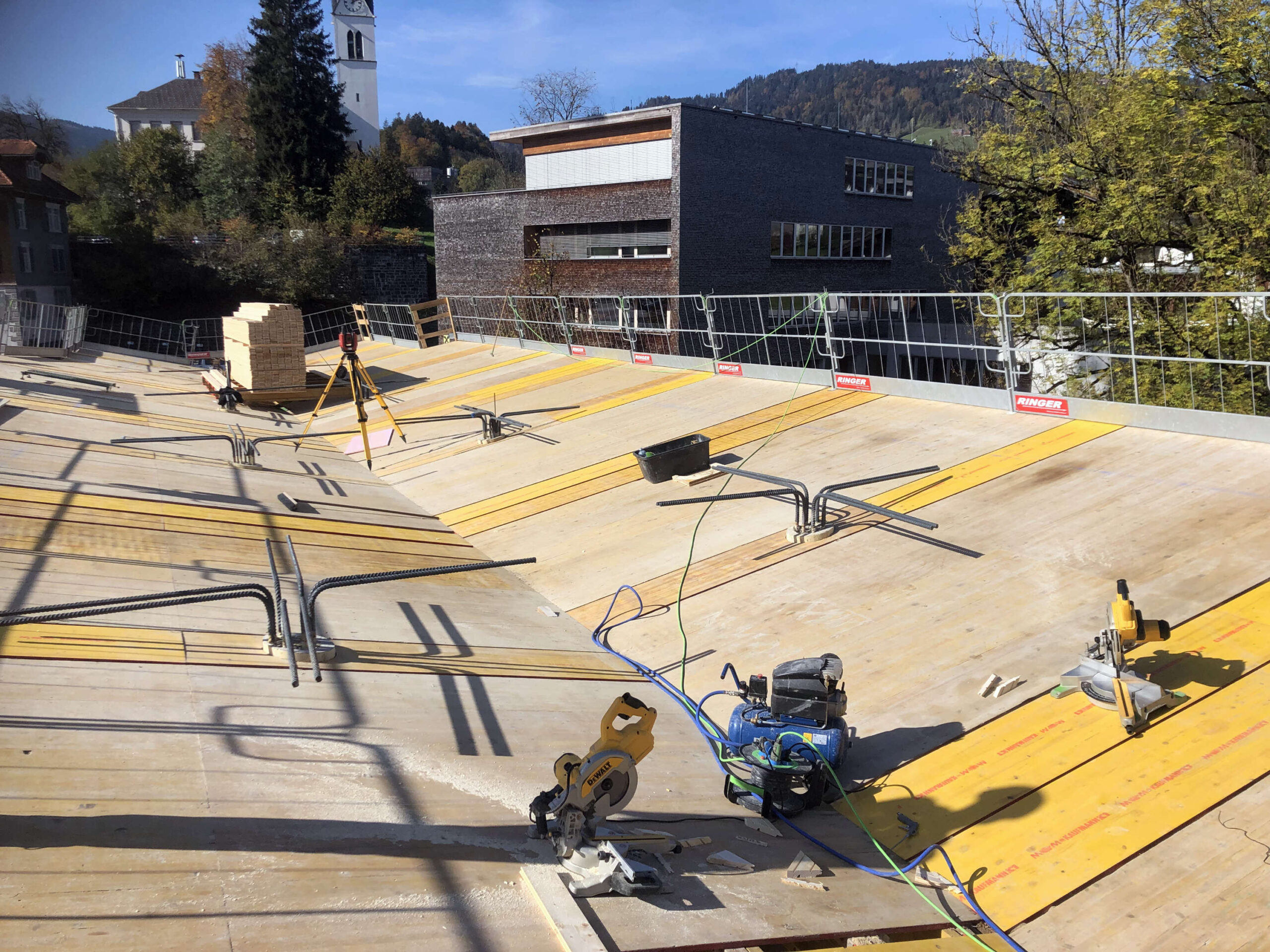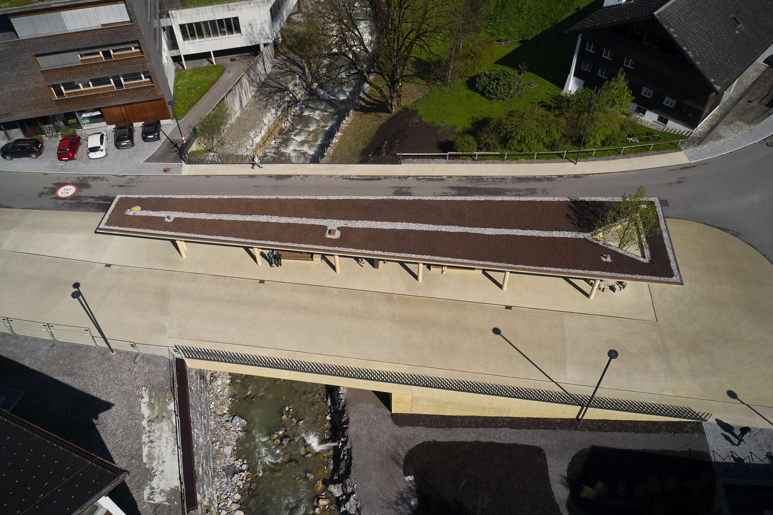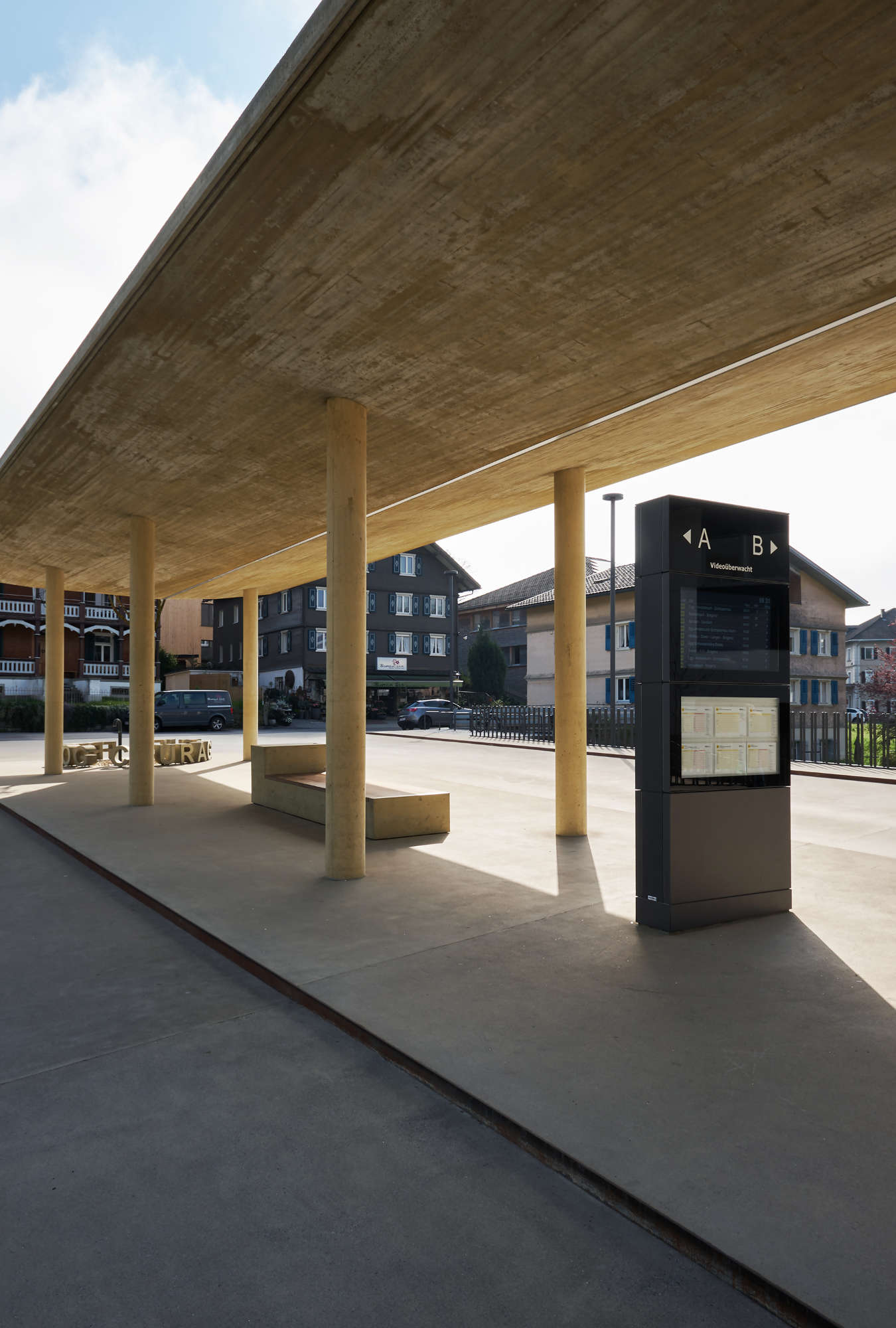 Die Überdachung hat eine Länge von 44,5 m und Breiten von 4,2 bis 9,1 m. Der Dachrand ist 15,0 cm stark, in Dachmitte 54,0 cm bis 90,0 cm. Das Dach ist auf sechs Stützenpaaren in die Fundamente und in die Brückentragstruktur eingespannt. Die Bussteigüberdachung wurde mit extensiver Begrünung ausgeführt.