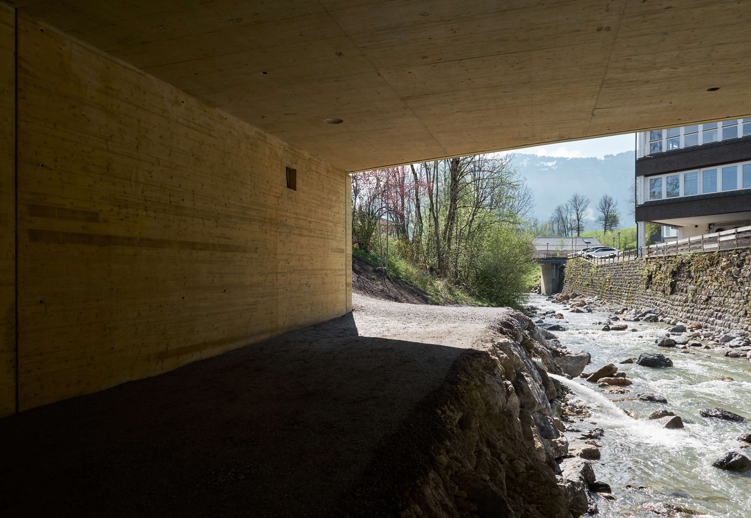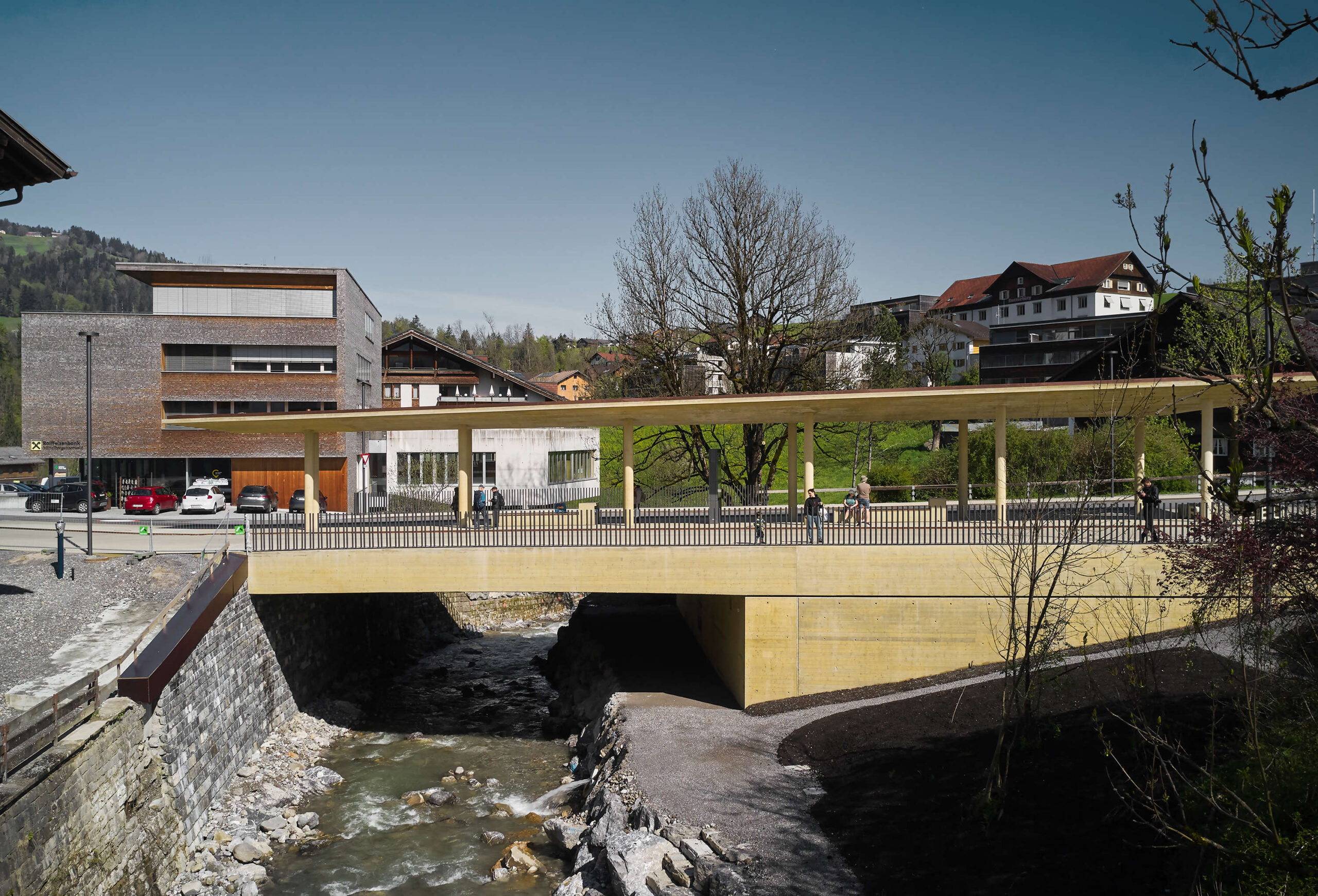 Die Spurenaufteilung ist so gestaltet, dass an wartenden Bussen vorbeigefahren werden kann. Um eine lange Nutzungsdauer zu ermöglichen, wurden die Haltestreifen und Zufahren in Hartbeton ausgeführt. Der Beton der Brücke, der Fahrbahn sowie des Mittelsteigs und Dachkonstruktion sind gelb eingefärbt. Die Absturzsicherung ist aus einzelnen Formrohren gebildet. Der Zugang und die Möglichkeit zum Verweilen am Ufer des Schmittenbachs wurden ebenfalls umgesetzt.